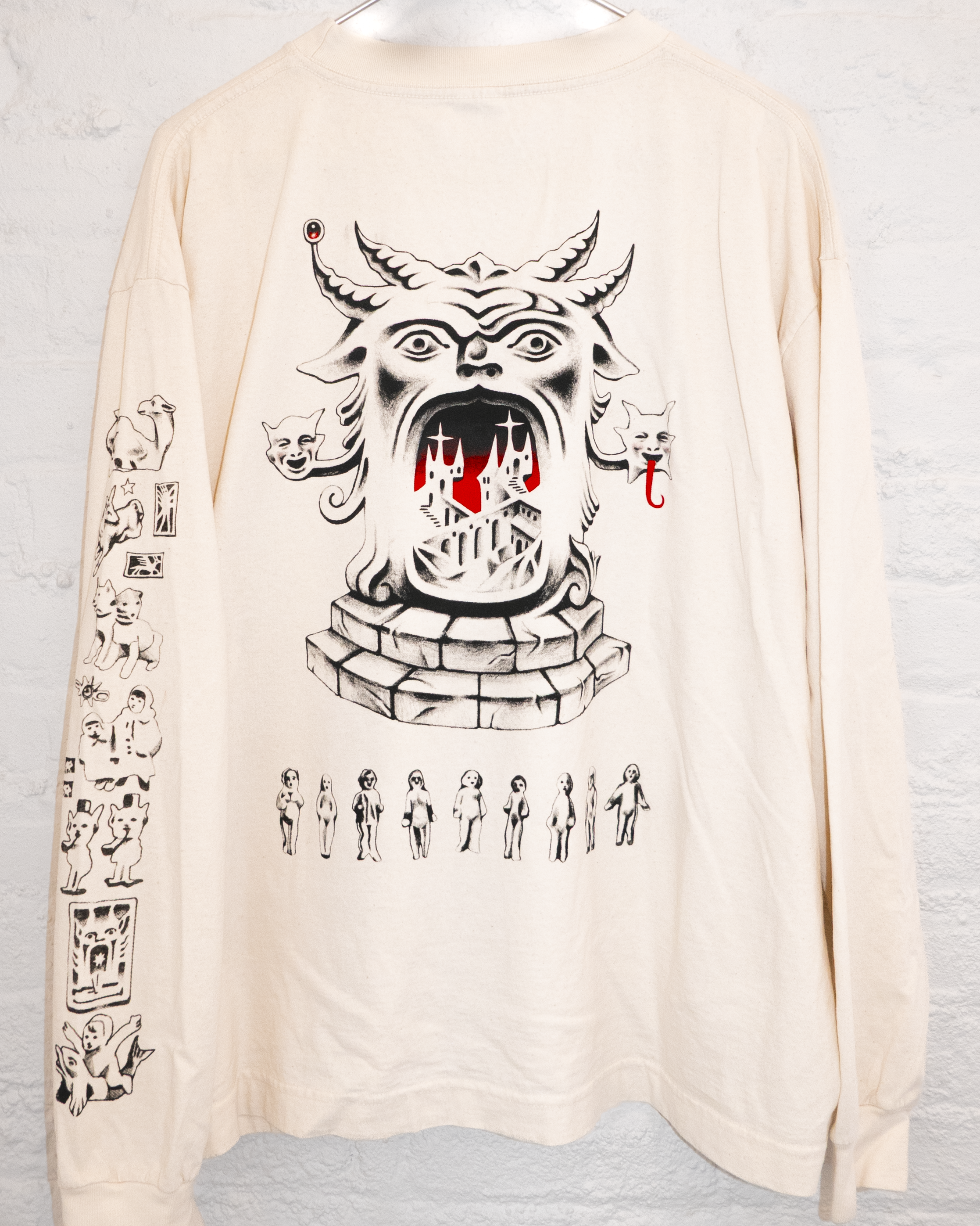 Screen printed on 100% cotton Everybody.World boxy long-sleeve shirtAn eclectic composition that really exemplifies Lu’s serene, yet chilling style. This overall print features Medieval architecture, gems, glyphs, creatures and figures that feel at once familiar and otherworldly. If you’re a fan of Lu Walstad, you’ll love this piece.